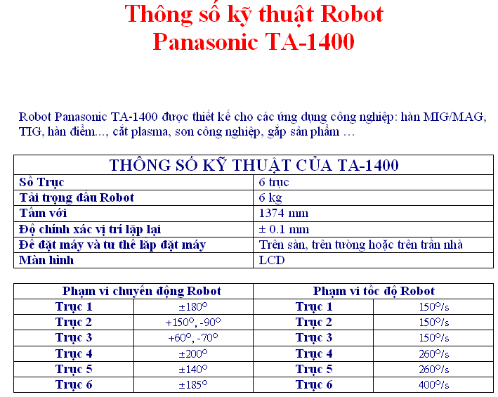 Robot Panasonic AW-05C được thiết kế cho các ứng dụng công nghiệp: hàn MIG/MAG/TIG, hàn điểm..., cắt plasma, sơn công nghiệp, gắp sản phẩm